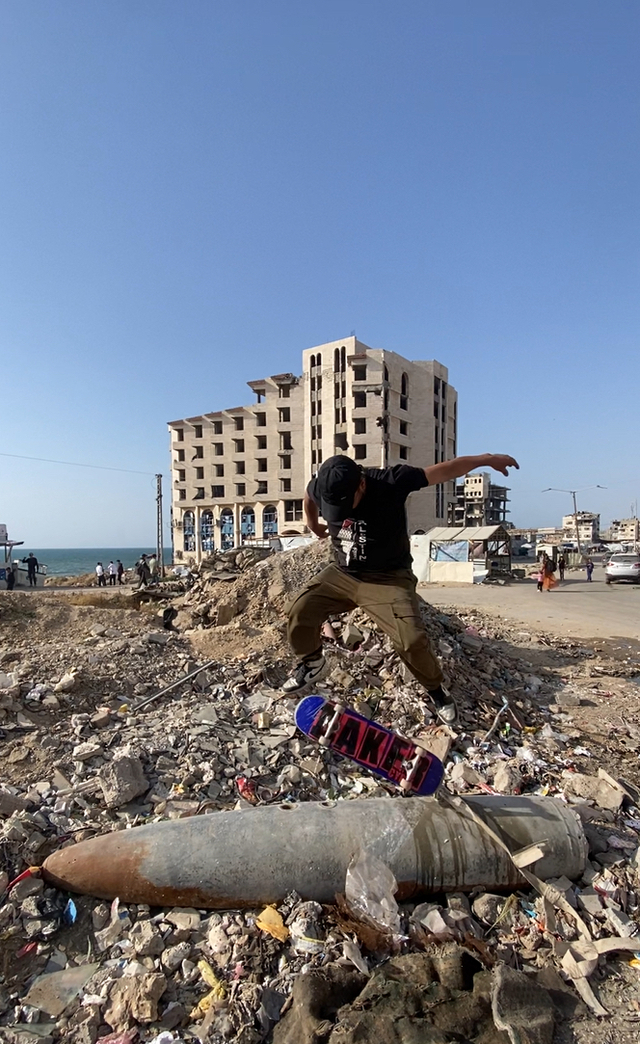 In a powerful act of resilience and perseverance, Rajab Al Reefi and his peers in the self-proclaimed Gaza Skate Team, capture their lives within a war-torn landscape and their attempts to hold onto some sense of freedom and agency through the simple act of skating. Documenting their efforts through photographs and videos, the exhibition shares scenes of young people reclaiming bombed streets as makeshift skateparks, rolling over fractured concrete, jumping fallen pylons, and even balancing atop an unexploded missile in one heart-in-mouth scene.