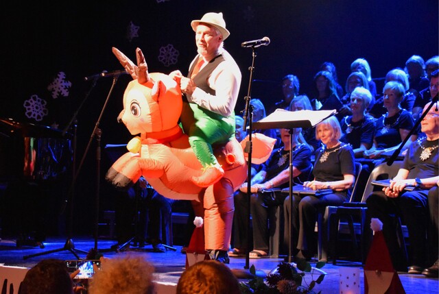 As well as Ukrainian, the 50-strong choir sang in Spanish, German, Estonian, Tagalog (Philippines), Latin and English under the direction of conductor Kim Kirkman resplendent in a blow-up reindeer suit during the Peruvian song “El burrito sabanero”.
