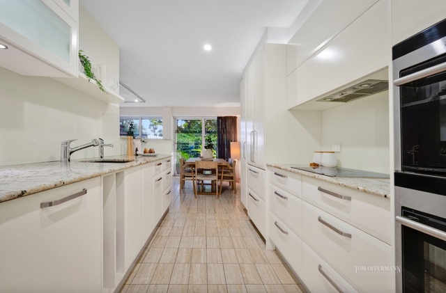 The designer kitchen is both functional and refined, featuring thick Caesarstone benchtops, an oversized island breakfast bar, and a full suite of premium Miele appliances including dual ovens, induction and wok burners, plate warmer and dishwasher.