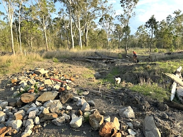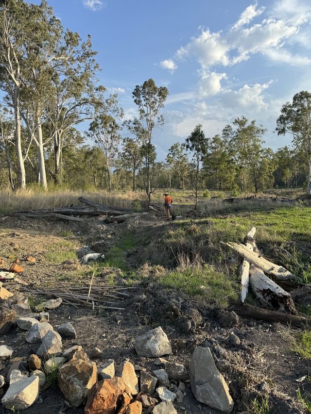 It was something Neil had been doing – pushing up logs, lantana, rocks, topsoil and anything he can find to slow the flow of water in the creek.