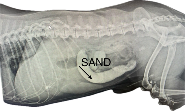 “He had eaten so much sand that it caused an intestinal impaction. He needed to be hospitalised for two days on intravenous fluids and medications to stop the vomiting and get his intestines moving again.”