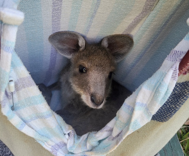 It’s hard to tell whether the six-month-old joey is eager to explore the world beyond the fabric or he’s simply ready for his next bottle.