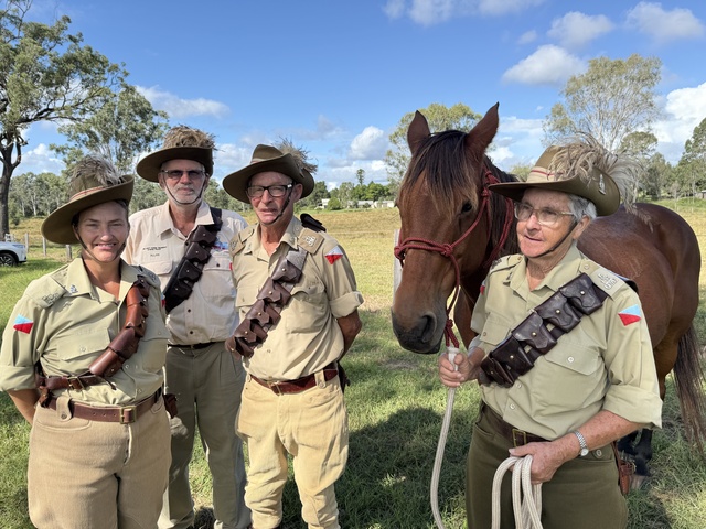 Not far away, resting in the shade before saddling up to help lead the street parade, was a group from Fifth Lighthorse Regiment Gympie Troop.