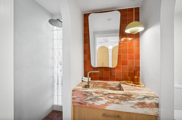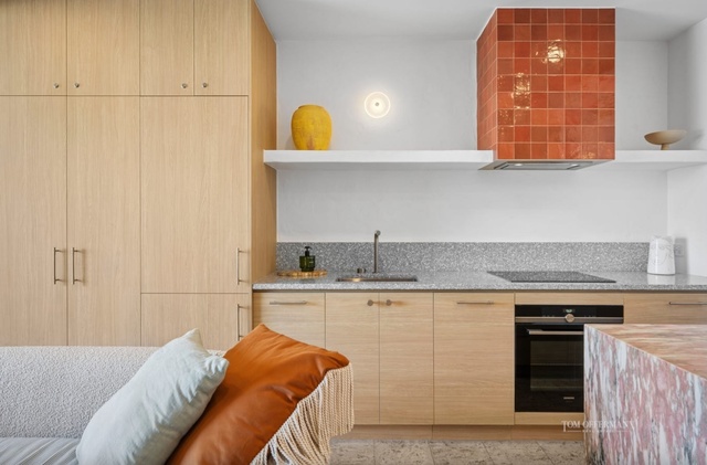 The undercover terraces feature sun lounges, and a day bed. The galley kitchen features grey terrazzo-topped oak cabinetry including lower as well as floor-to-ceiling cabinetry.