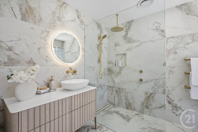 The undercover terraces feature sun lounges, and a day bed. The galley kitchen features grey terrazzo-topped oak cabinetry including lower as well as floor-to-ceiling cabinetry.