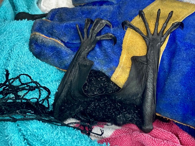 On Monday 16 February there was a very agitated black flying fox which lunged at my hand and scratched me while I was taking pictures of the rescuers disentangling it.