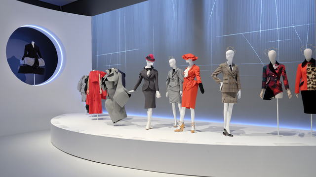 Major showstopping moments in the exhibition include a dramatic, spotlit gallery highlighting how both designers have been influenced by fashion and dressmaking history: Westwood’s sweeping silk taffeta ball gowns inspired by 18th century court dress are presented alongside Kawakubo’s punk interpretations in pink vinyl and rich floral jacquard. A further dynamic display juxtaposes the bold, red tartans, English tweeds, grey plaids and navy pinstripes of Kawakubo with Westwood’s iconic tailoring. Sculptural, deconstructed, cinched and exaggerated silhouettes demonstrate their exacting approaches to cutting and textile traditions.