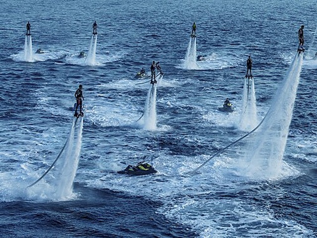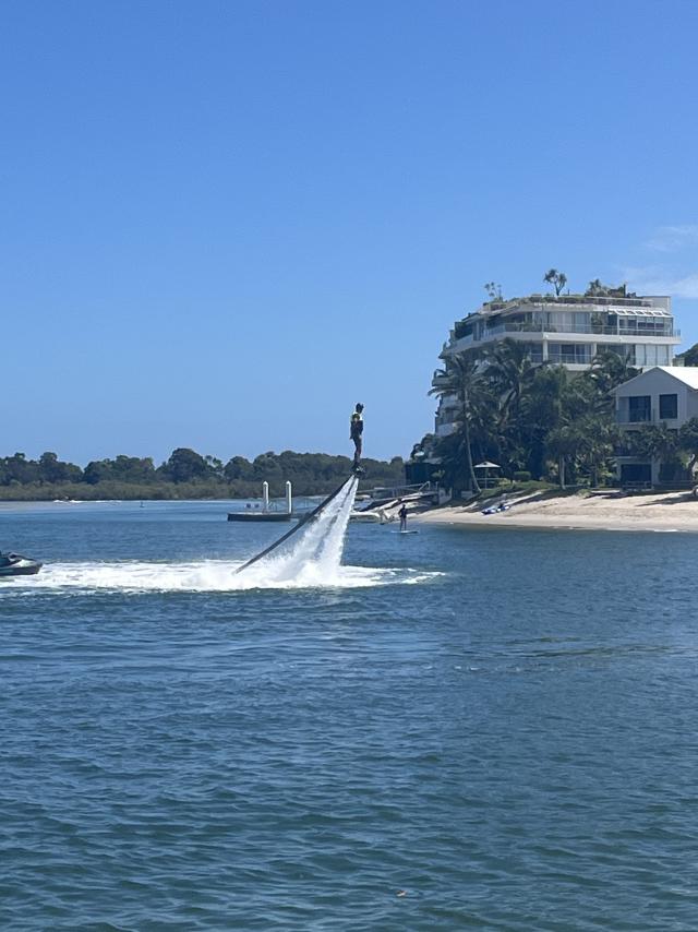 For those who don’t keep up, the flyboard was invented in 2012 by Frenchman Franky Zapata. (I’m not making this up.) The design allows the device to climb out of the water and be stable in the air, a position achieved by underfoot propulsion and hand stabilisation while the rider is attached to a jet ski via a long hose. Thank you, Wikipedia. Introduced to Australia about a decade ago, the flyboard started appearing on the Noosa River over the 25-26 summer.